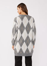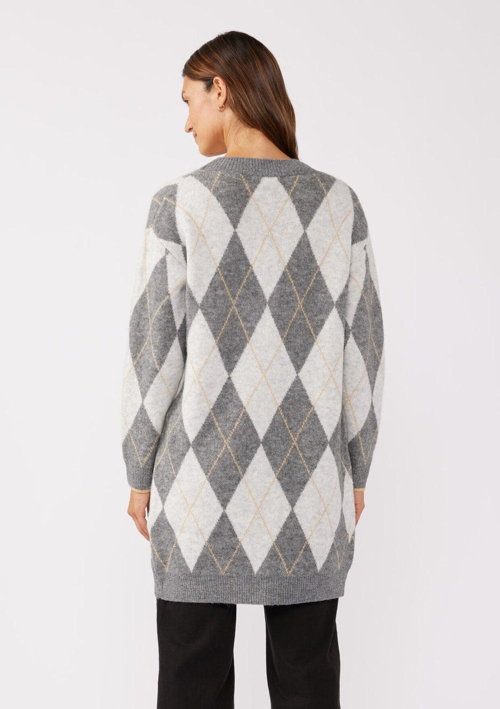 A classic mid-length knit cardigan featuring an all-over argyle pattern.