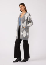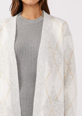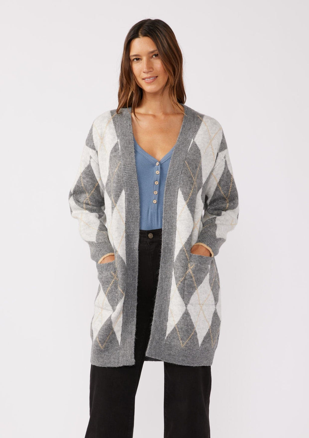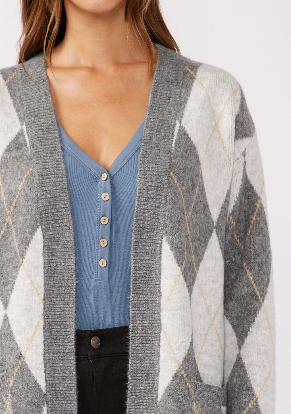 An oversize argyle pattern adds a classic collegiate feel to this must-have cardigan. Featuring an open front, essential side pockets, and long sleeves. A cozy touch to any outfit, we love to pair this warm sweater with denim and a fall ankle boot.