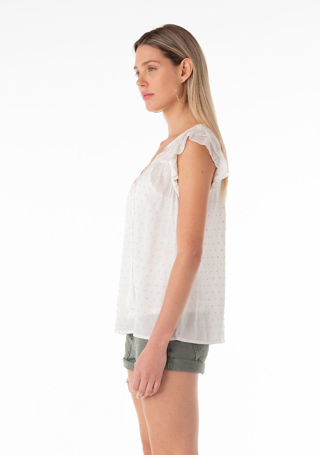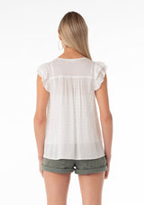 A classic short flutter sleeve bohemian spring top in a multi-color clip dot.
