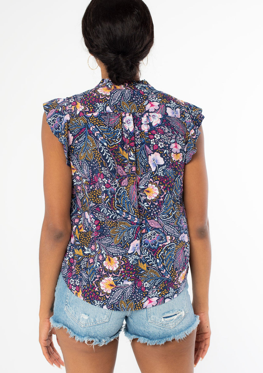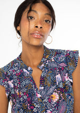 Everyone's favorite button-front top is back in a retro-inspired floral print. With short flutter cap sleeves, a ruffled neckline, and a flattering relaxed it. A classic day-to-night style that pairs effortlessly with denim cut-off shorts or tucked into trousers.