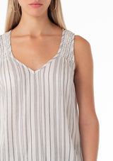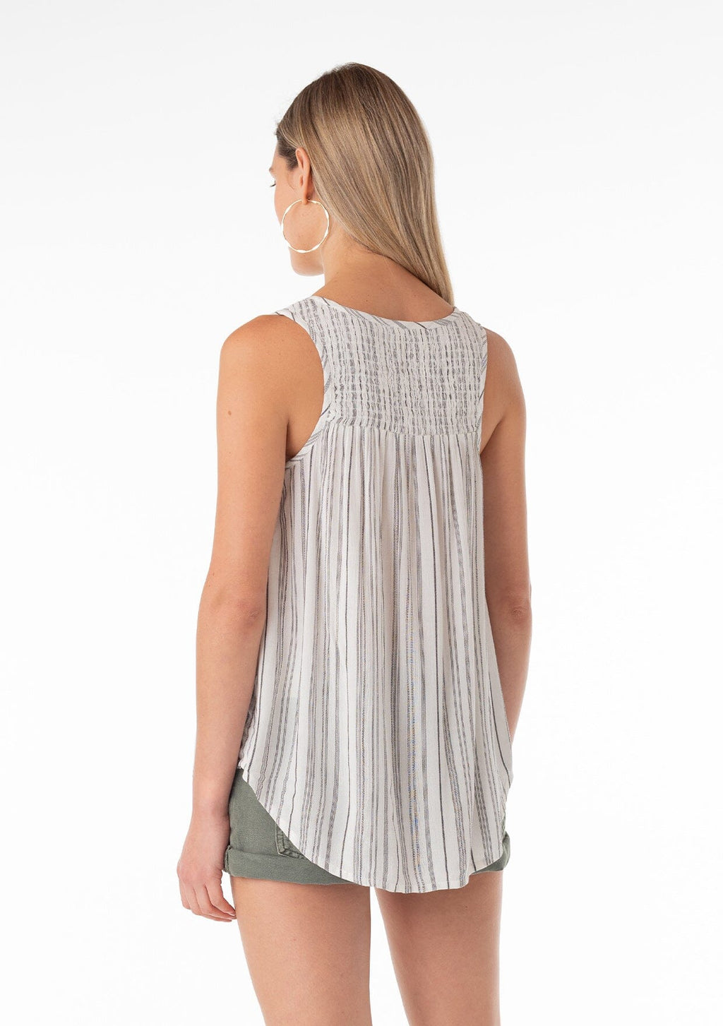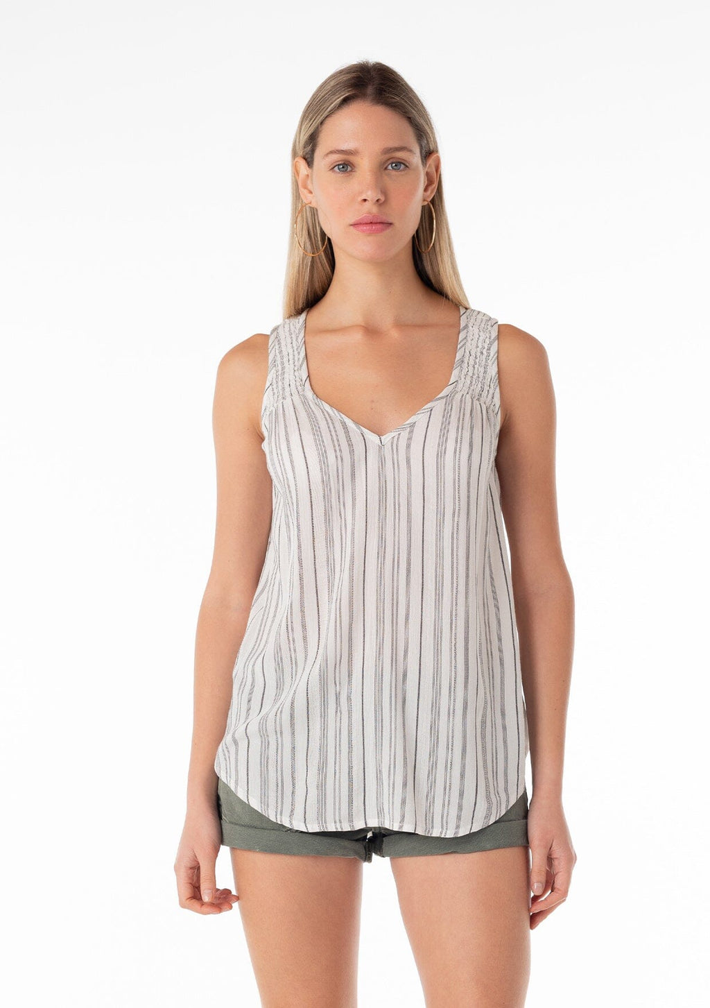 Sweet and simple, our effortless tank top features a classic striped detail. With a flattering v-neckline and smocked yoke detail. The perfect throw-on-and-go style for all season long.