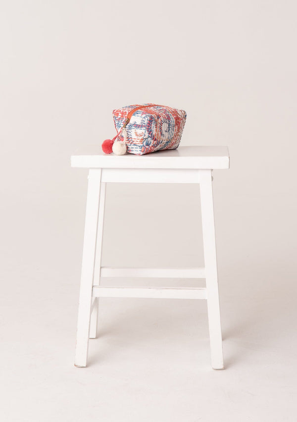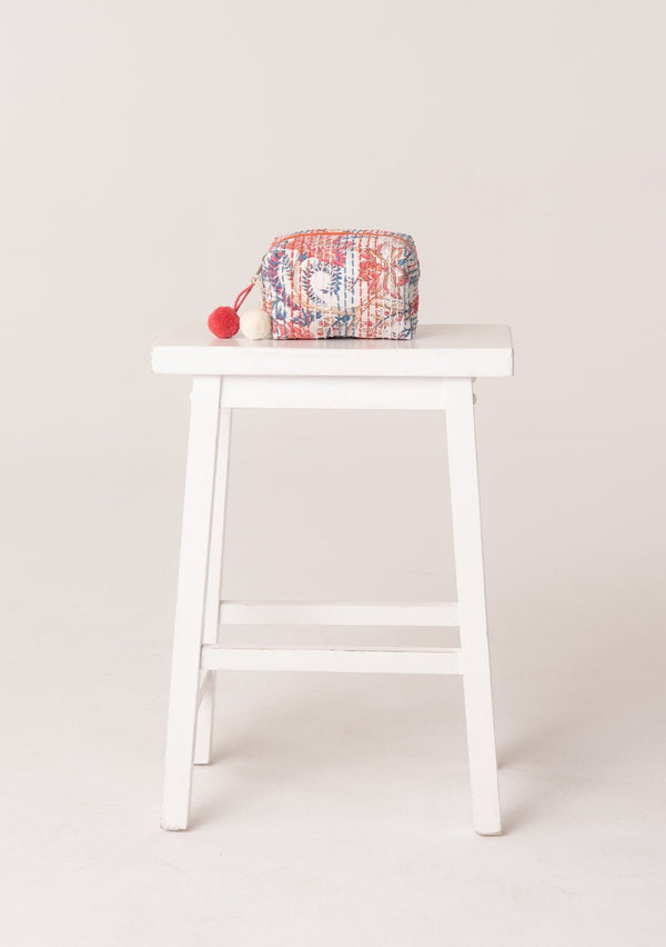 [Color: Natural/Blue/Pink] A bohemian small makeup travel bag in a pink, blue, and white floral print with a zip closure, stitch details throughout, and a pom accent.[Color: Natural/Blue/Pink] A bohemian small makeup travel bag in a pink, blue, and white floral print with a zip closure, stitch details throughout, and a pom accent.