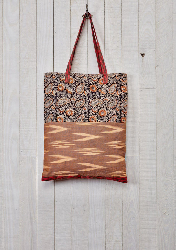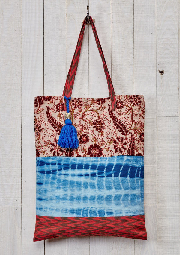 [Color: Black/Blue] An oversized bohemian tote bag with a black patterned exterior and contrast blue interior. With gold metallic lurex thread details, a sequined hand motif, an oversized tassel accent, two suede top handles, and a magnetic snap closure. [Color: Black/Blue] An oversized bohemian tote bag with a black patterned exterior and contrast blue interior. With gold metallic lurex thread details, a sequined hand motif, an oversized tassel accent, two suede top handles, and a magnetic snap closure.