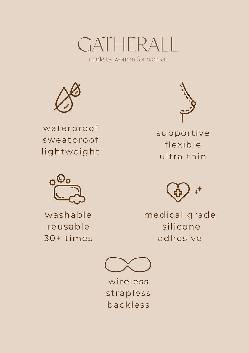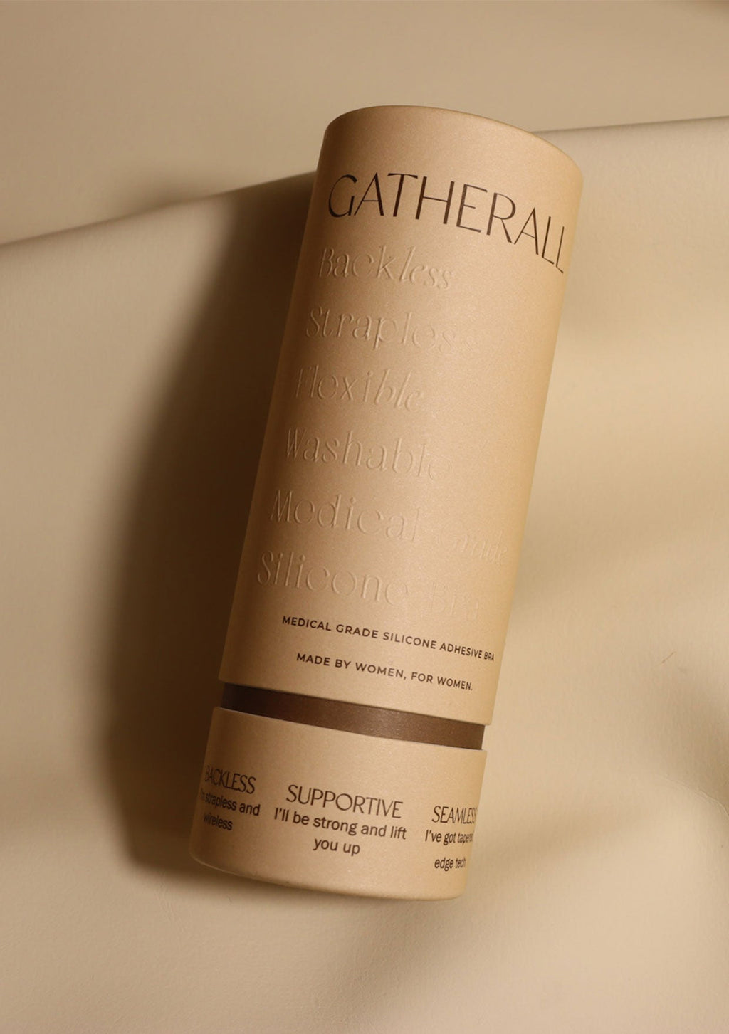 When going braless is not an option. Gatherall's reusable backless and strapless bra is made from 100% medical-grade adhesive silicone. Flexible yet supportive, this versatile wireless bra will have you feeling confident no matter what you're wearing.