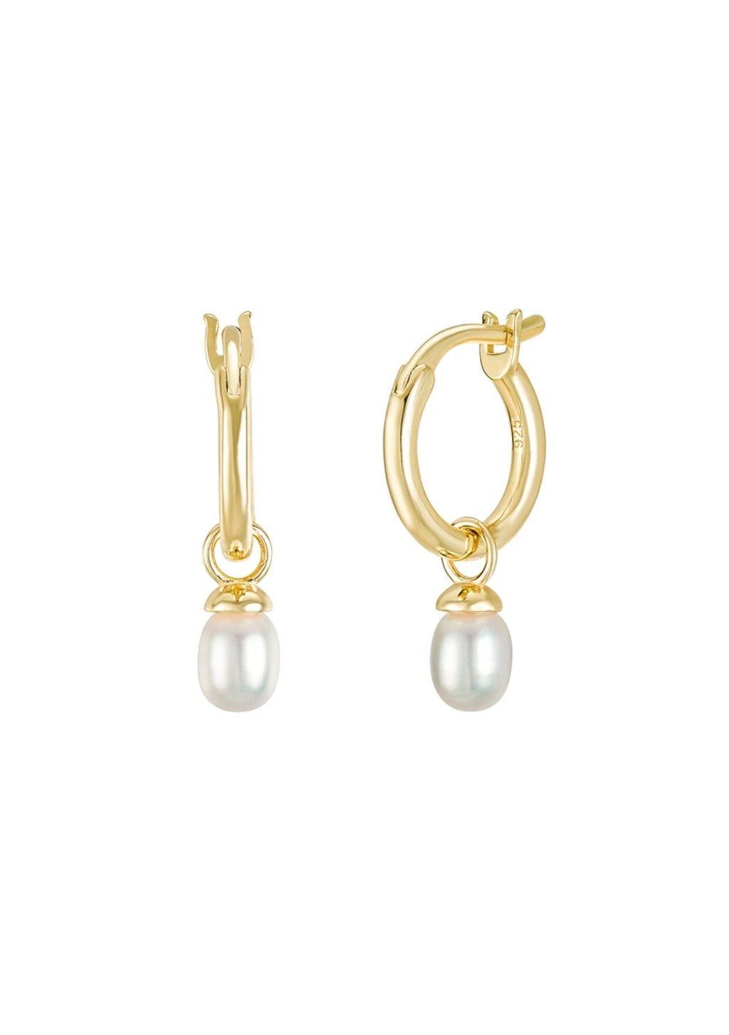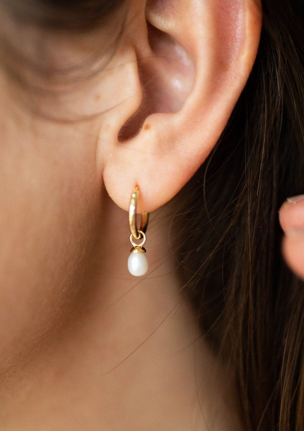 Dive into timeless elegance with these drop pearl hoop earrings. The sleek hoop gracefully wraps around the ear, while a suspended freshwater pearl adds a hint of beachy charm. Perfect for adding a touch of classic sophistication to any look.