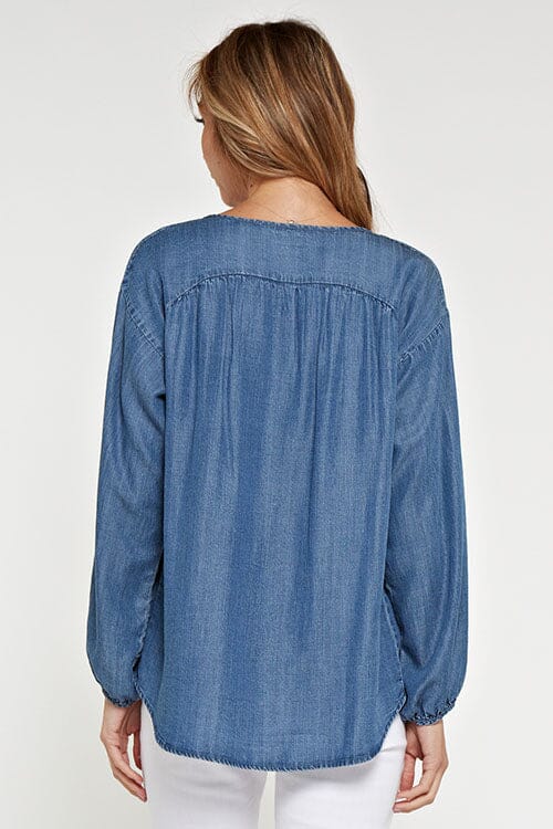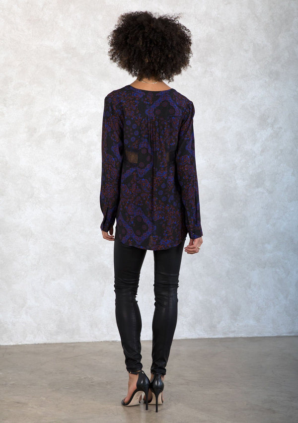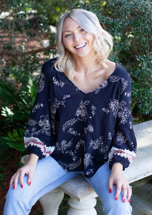 [Color: Blue/Black] A back facing image of a brunette model wearing a chiffon bohemian blouse in a black and blue floral border print. With long sleeves and a wide elastic neckline. [Color: Blue/Black] A front facing image of a brunette model wearing a chiffon bohemian blouse in a black and blue floral border print. With long sleeves and a wide elastic neckline.