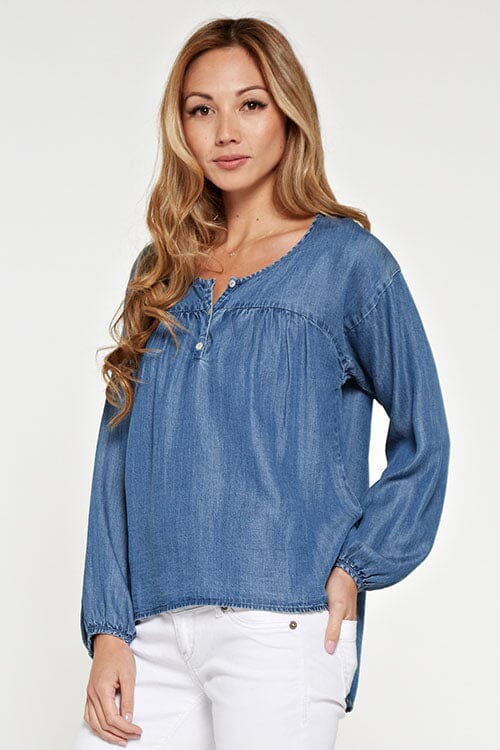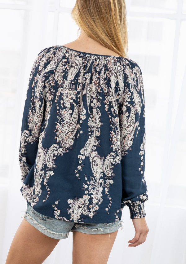 [Color: Navy/Tan] A close up front facing image of a brunette model wearing a navy and tan paisley print peasant top. A classic flowy bohemian blouse with long sleeves, a loop button front, and elastic wrist cuffs. [Color: Navy/Tan] A front facing image of a brunette model wearing a navy and tan paisley print peasant top. A classic flowy bohemian blouse with long sleeves, a loop button front, and elastic wrist cuffs.