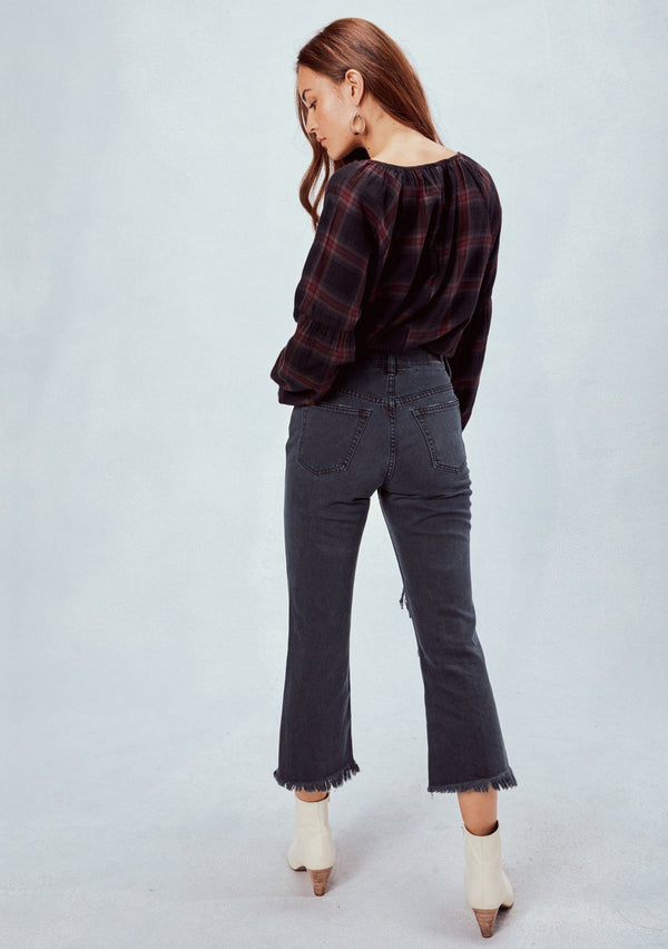 [Color: Black] A back facing image of a blonde model wearing a black linen blend bohemian blouse. With voluminous long sleeves, delicate crochet trim, and a self covered button front.[Color: Black] A front facing image of a blonde model wearing a black linen blend bohemian blouse. With voluminous long sleeves, delicate crochet trim, and a self covered button front.