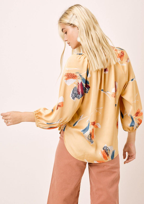 [Color: Natural/Dusty Lilac] A half body front facing image of a blonde model wearing a bohemian blouse in a lilac purple and natural off white mixed floral print. With voluminous long sleeves and a v neckline.[Color: Natural/Dusty Lilac] A half body front facing image of a brunette model wearing a bohemian blouse in a lilac purple and natural off white mixed floral print. With voluminous long sleeves and a v neckline.