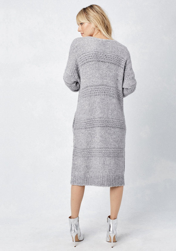 [Color: Black/Grey] A back facing image of a brunette model wearing a black and grey mixed knit long duster cardigan.[Color: Black/Grey] A front facing image of a brunette model wearing a black and grey mixed knit long duster cardigan.