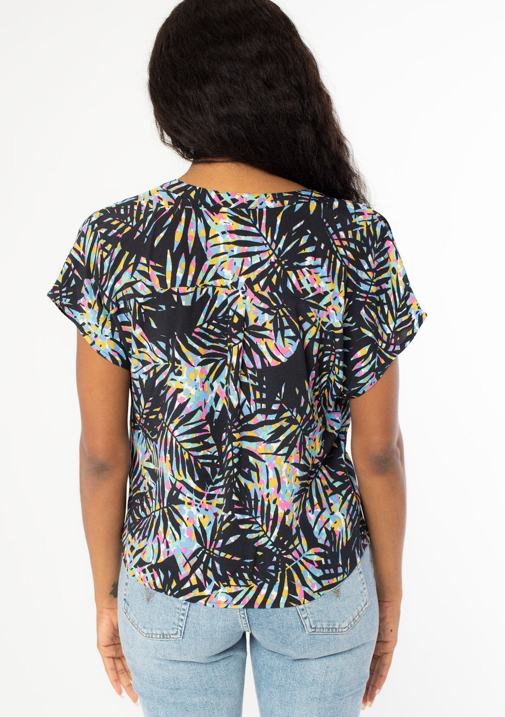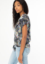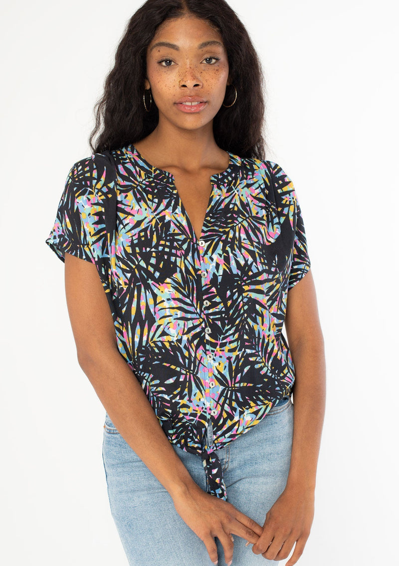 A dreamy bohemian short sleeve top with a tie-front detail and a multicolor tropical palm print.