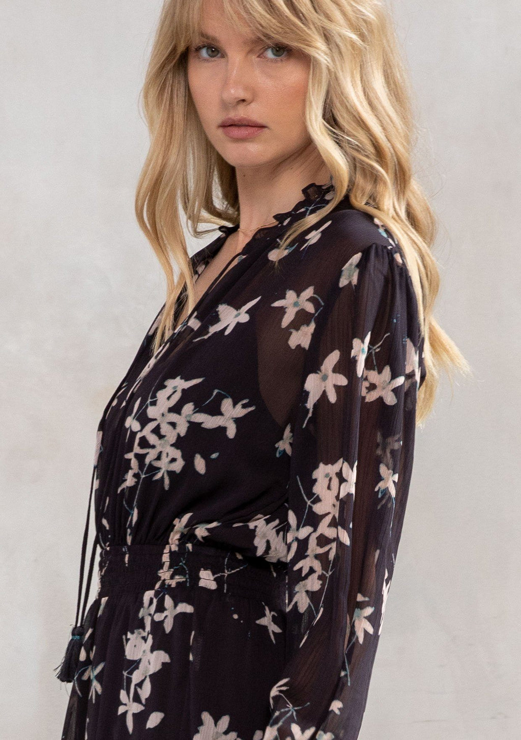• Split v-neckline with tassel ties