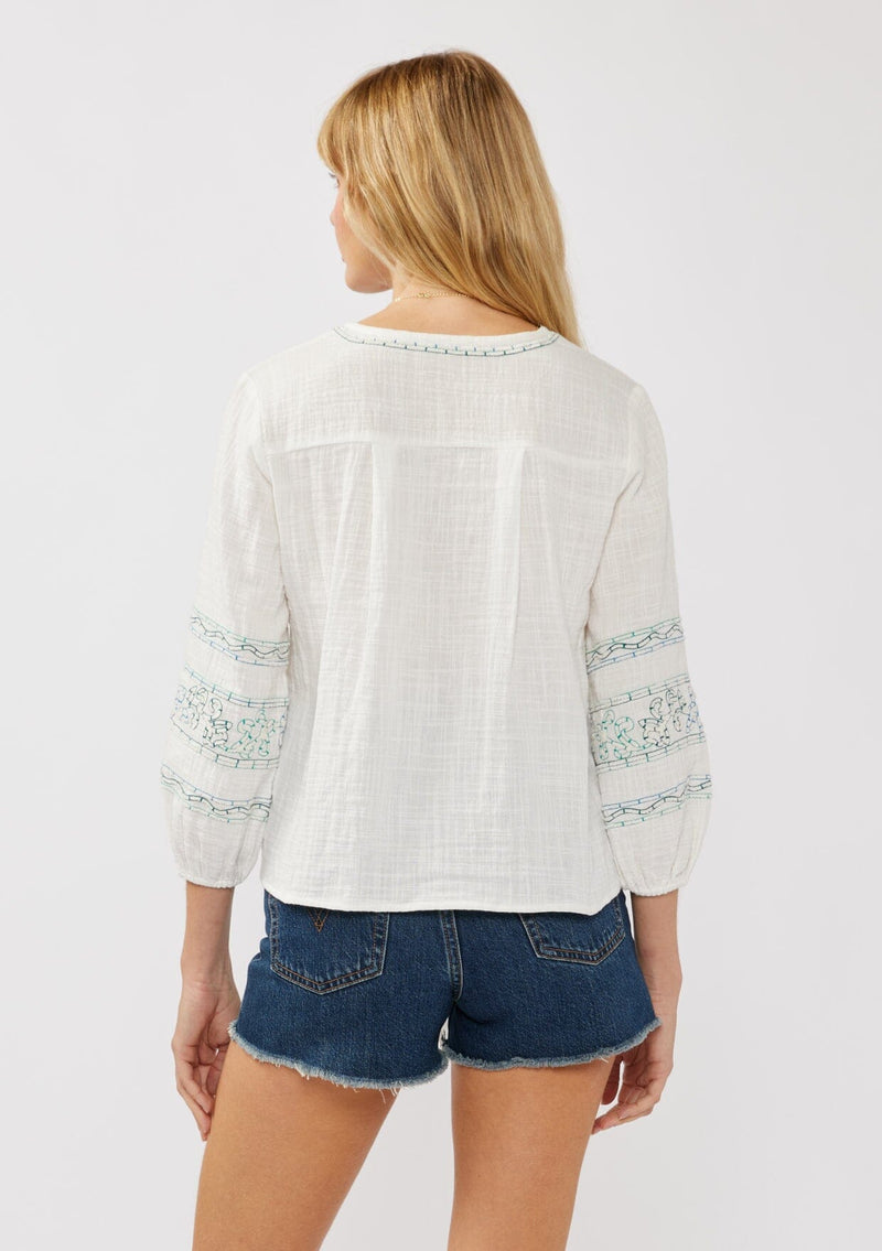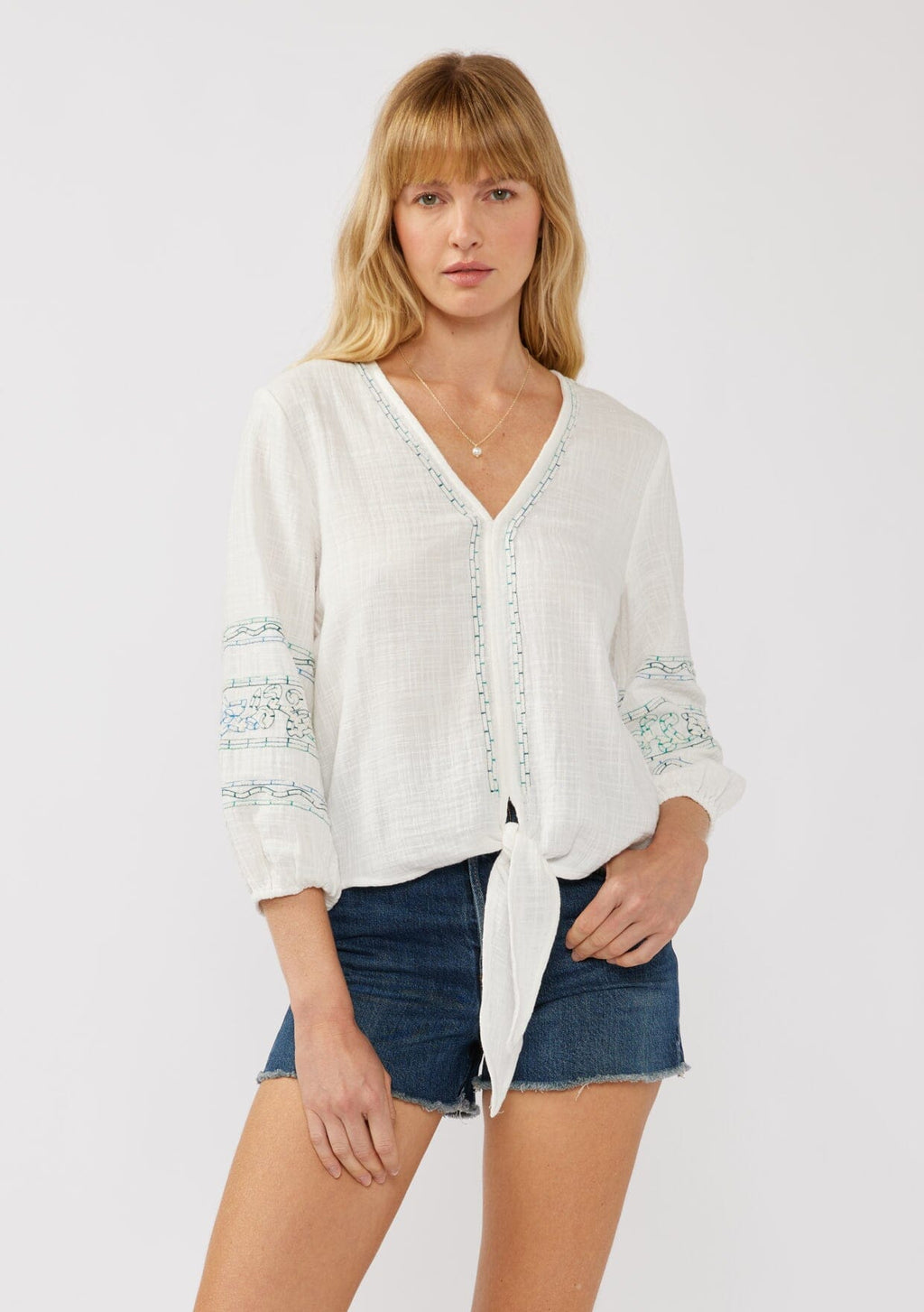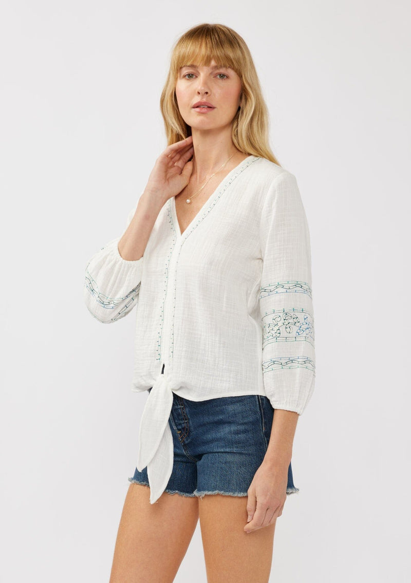 Charming embroidered details add a boho chic touch to this classic blouse. With feminine 3/4 length sleeves, a v-neckline, and a tie waist detail. We love to pair this lightweight cotton top with our favorite cut off denim shorts for an easy, laidback vacation look.
