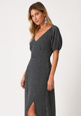 A classic puff sleeve boho maxi dress in a navy blue dot print.