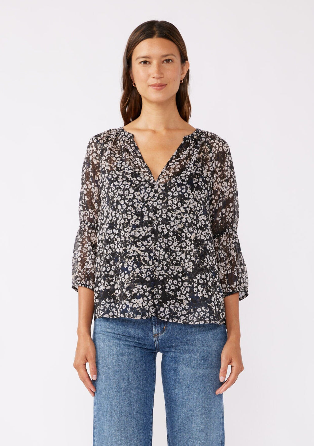 Discover our eye-catching blouse in black and ivory floral print, adorned with shimmering metallic clip dot details. Crafted from lightweight chiffon, this classic bohemian piece features 3/4 length sleeves, an elastic cuff with an additional elastic band above the elbow, a flattering split v-neckline, and a flowy, relaxed fit. Perfect for transitioning seamlessly from the office to happy hour.