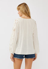 Elevate your boho wardrobe with this timeless blouse, showcasing intricate sleeve details and a flattering split v-neckline. Crafted from a lightweight rayon-linen blend, this blouse is your ultimate go-to for effortless comfort and versatile day-to-day styling. Pair it with cutoff denim shorts for a carefree vibe that’s perfect for laid-back outings.