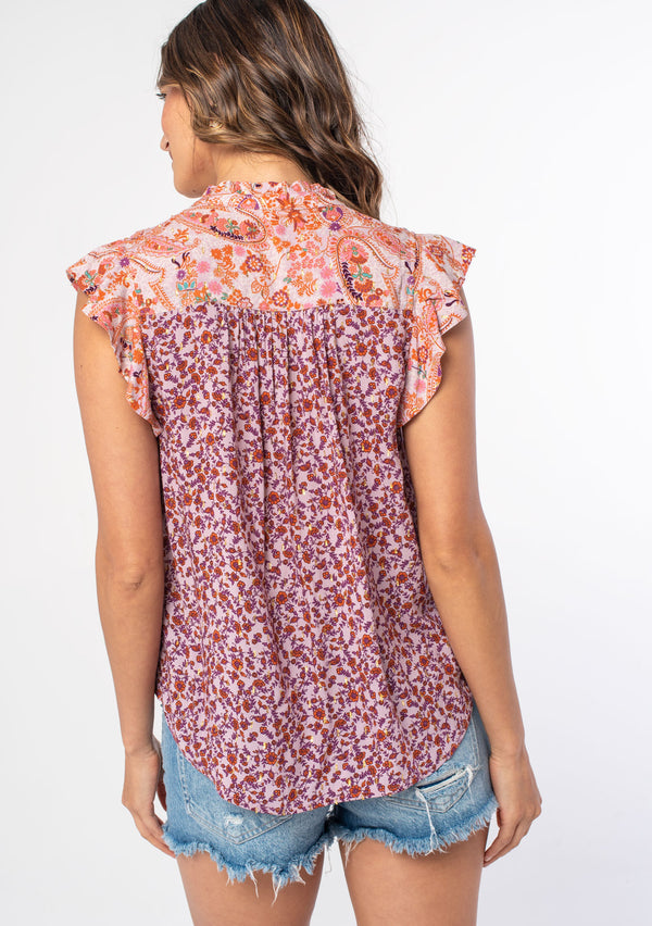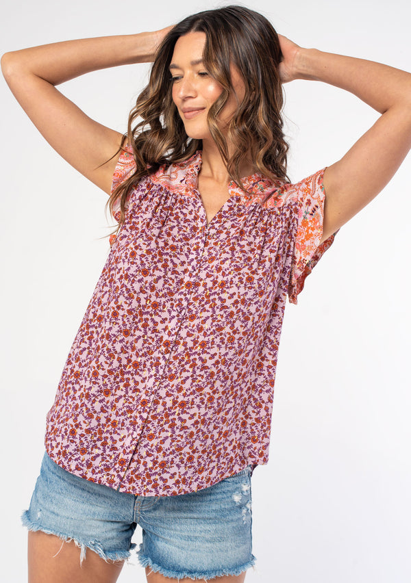 [Color: Ivory/Taupe] A back facing image of a blonde model wearing a lightweight spring top in a white and taupe purple floral print, with metallic thread detail. With short flutter sleeves, a relaxed fit, and a split v neckline. [Color: Ivory/Taupe] A front facing image of a blonde model wearing a lightweight spring top in a white and taupe purple floral print, with metallic thread detail. With short flutter sleeves, a relaxed fit, and a split v neckline.