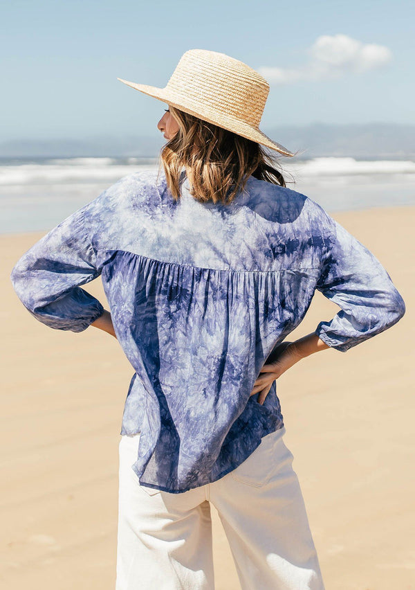 [Color: Cobalt/Tan] A back facing image of a brunette model wearing a navy blue and tan butterfly wing print top with three quarter length voluminous sleeves and a tie front detail. [Color: Cobalt/Tan] A front facing image of a brunette model wearing a navy blue and tan butterfly wing print top with three quarter length voluminous sleeves and a tie front detail.