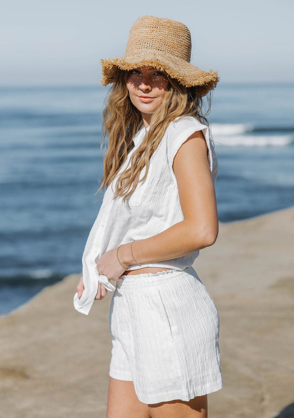 [Color: Mocha] An image of a brunette model wearing a short dolman sleeve top with a button front, single pocket, and tie front detail. [Color: Mocha] An image of a brunette model wearing a short dolman sleeve top with a button front, single pocket, and tie front detail.