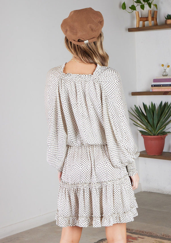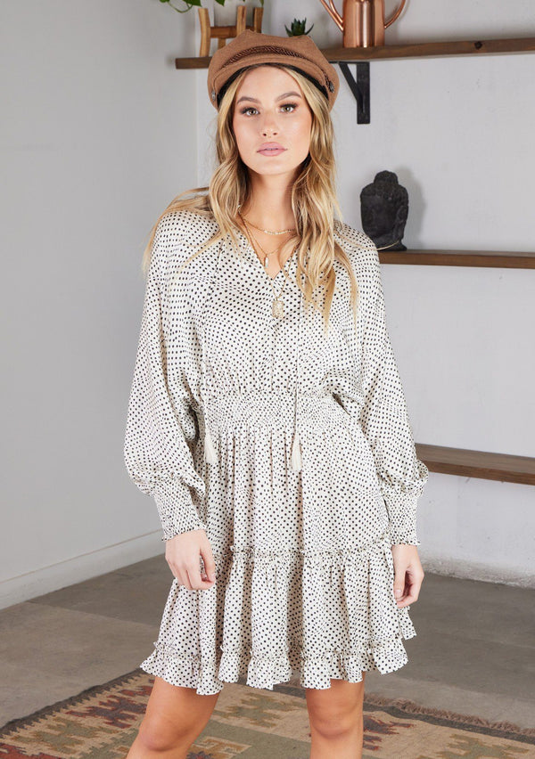 [Color: Ivory Black] The perfect bohemian dress for every season! Our polka dot mini dress features a flattering smocked elastic waist, long voluminous sleeves, and a split v neckline with tassel ties. [Color: Ivory Black] The perfect bohemian dress for every season! Our polka dot mini dress features a flattering smocked elastic waist, long voluminous sleeves, and a split v neckline with tassel ties.