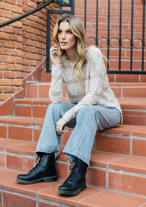 [Color: Bone] A side facing image of a brunette model wearing a open knit lightweight cardigan with fringe accents. An easy throw on for casual outings. [Color: Bone] A front facing image of a brunette model wearing a open knit lightweight cardigan with fringe accents. An easy throw on for casual outings.