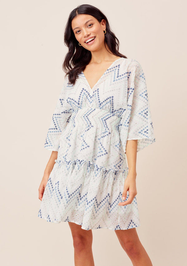 [Color: White/MultiBlue] Lovestitch kimono sleeve, embroidered eyelet chevron striped mini dress with smocked waist[Color: White/MultiBlue] Lovestitch kimono sleeve, embroidered eyelet chevron striped mini dress with smocked waist