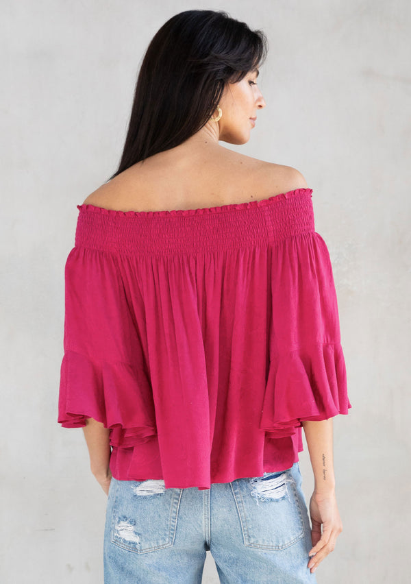 [Color: Black/Fuchsia] A model wearing a pretty black and fuchsia floral blouse with a ruffled off the shoulder neckline and an adjustable spaghetti strap. [Color: Black/Fuchsia] A model wearing a pretty black and fuchsia floral blouse with a ruffled off the shoulder neckline and an adjustable spaghetti strap.