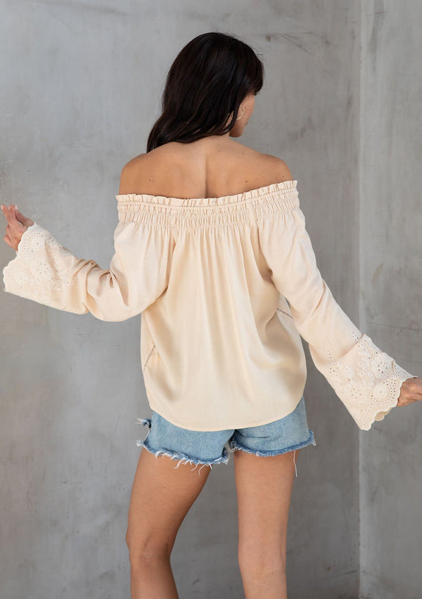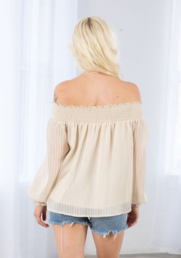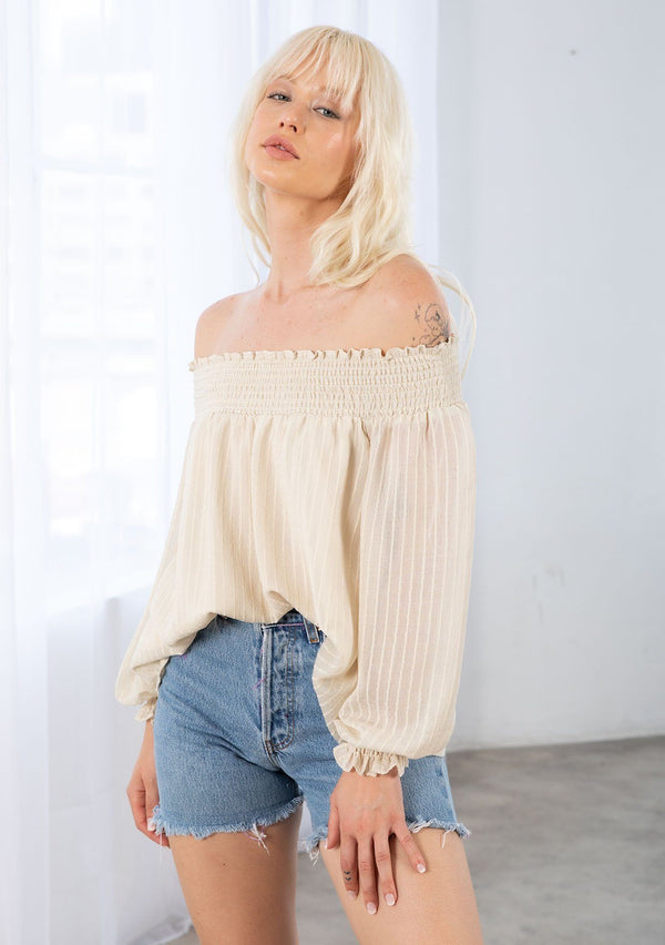 [Color: Vanilla] A model wearing a bohemian vanilla cream off shoulder top in a sheer shadow stripe. With long voluminous sleeves, a smocked elastic wrist cuff, and a smocked elastic off shoulder neckline. [Color: Vanilla] A model wearing a bohemian vanilla cream off shoulder top in a sheer shadow stripe. With long voluminous sleeves, a smocked elastic wrist cuff, and a smocked elastic off shoulder neckline.