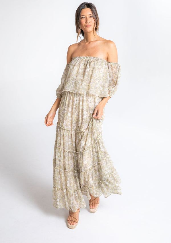 [Color: Lemon/Off White] A model wearing a sheer chiffon off shoulder maxi dress in a yellow paisley print. [Color: Lemon/Off White] A model wearing a sheer chiffon off shoulder maxi dress in a yellow paisley print.
