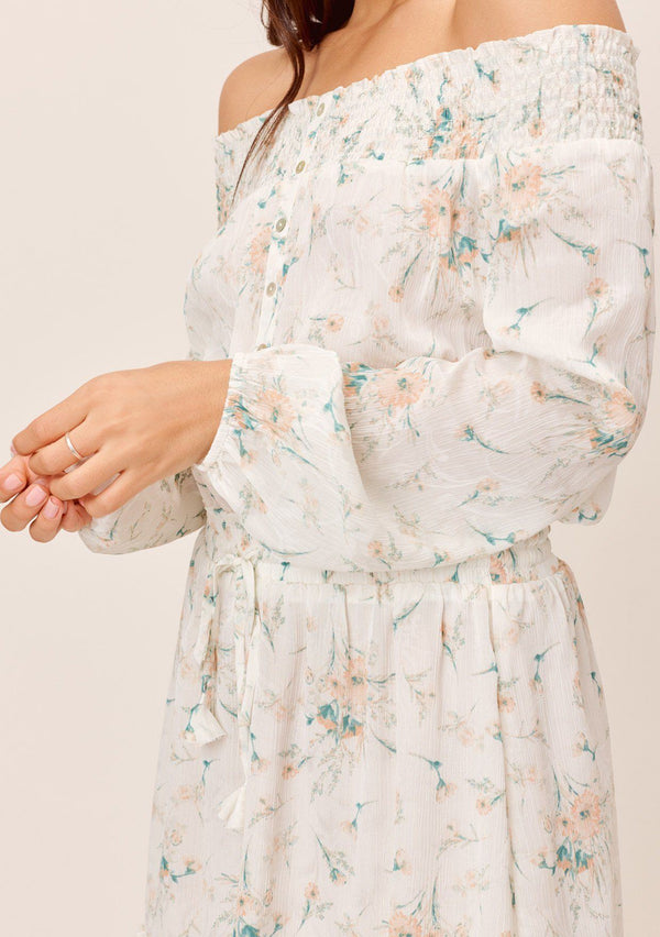 [Color: Lilac/Salmon] An image of a brunette model wearing a pink floral print off shoulder maxi dress with an adjustable waist tie, ruffled puff sleeves, and a front slit. A bohemian dress perfect for the summer. [Color: Lilac/Salmon] An image of a blonde model wearing a pink floral print off shoulder maxi dress with an adjustable waist tie, ruffled puff sleeves, and a front slit. A bohemian dress perfect for the summer.
