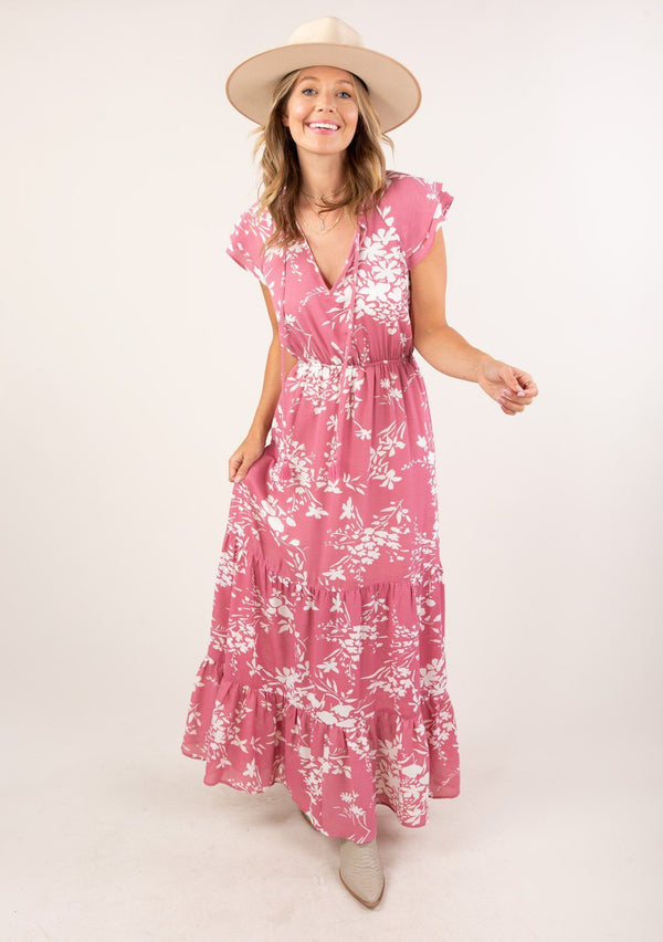 [Color: Black/Fuchsia] A model wearing a timeless flowy bohemian maxi dress in a black and fuchsia ditsy floral print. With short flutter sleeves, a deep v neckline, and a leg baring side slit.[Color: Black/Fuchsia] This effortless and feminine style features flattering short flutter sleeves, a leg-baring side slit, a fitted smocked top with a billowy tiered skirt for added shape and movement. This versatile style that can be dressed up or down, and will turn heads with it's unique print and elegant deep v-neckline.
