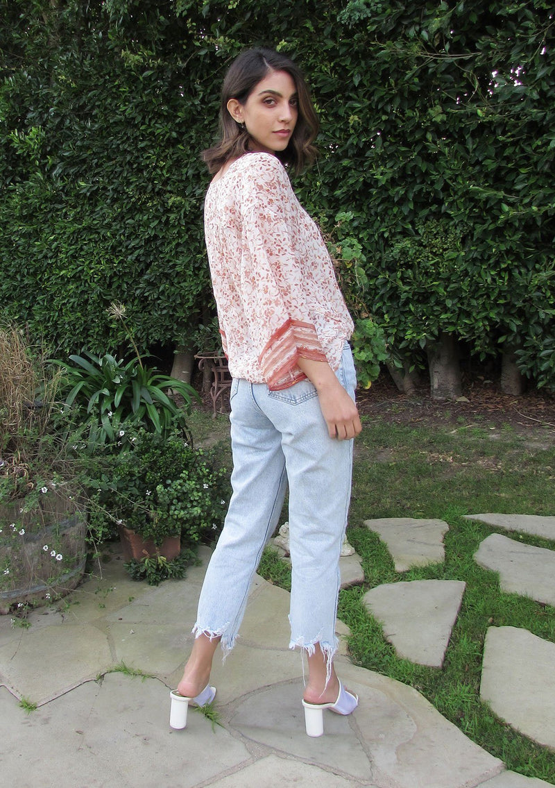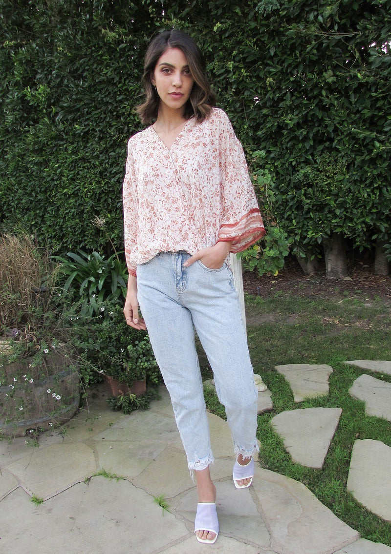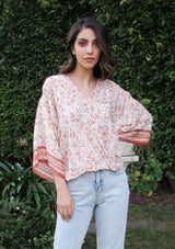 A touch of sparkle meets effortless bohemian style in our surplice front floral print top. Featuring flowy 3/4 length angel sleeves, a relaxed silhouette, and delicate shirring details.
