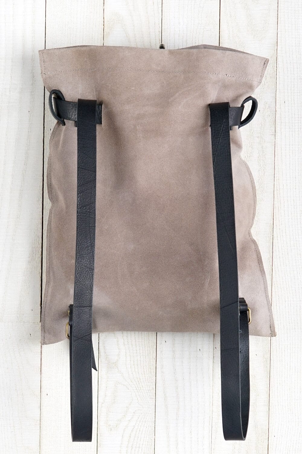 ![[Color: Sand/Nero] A light grey suede pouch backpack with an adjustable belt closure and leather shoulder straps.](http://www.shoplovestitch.com/cdn/shop/files/AL-0004_SAND-NERO-B_160x.jpg?v=1754347855)