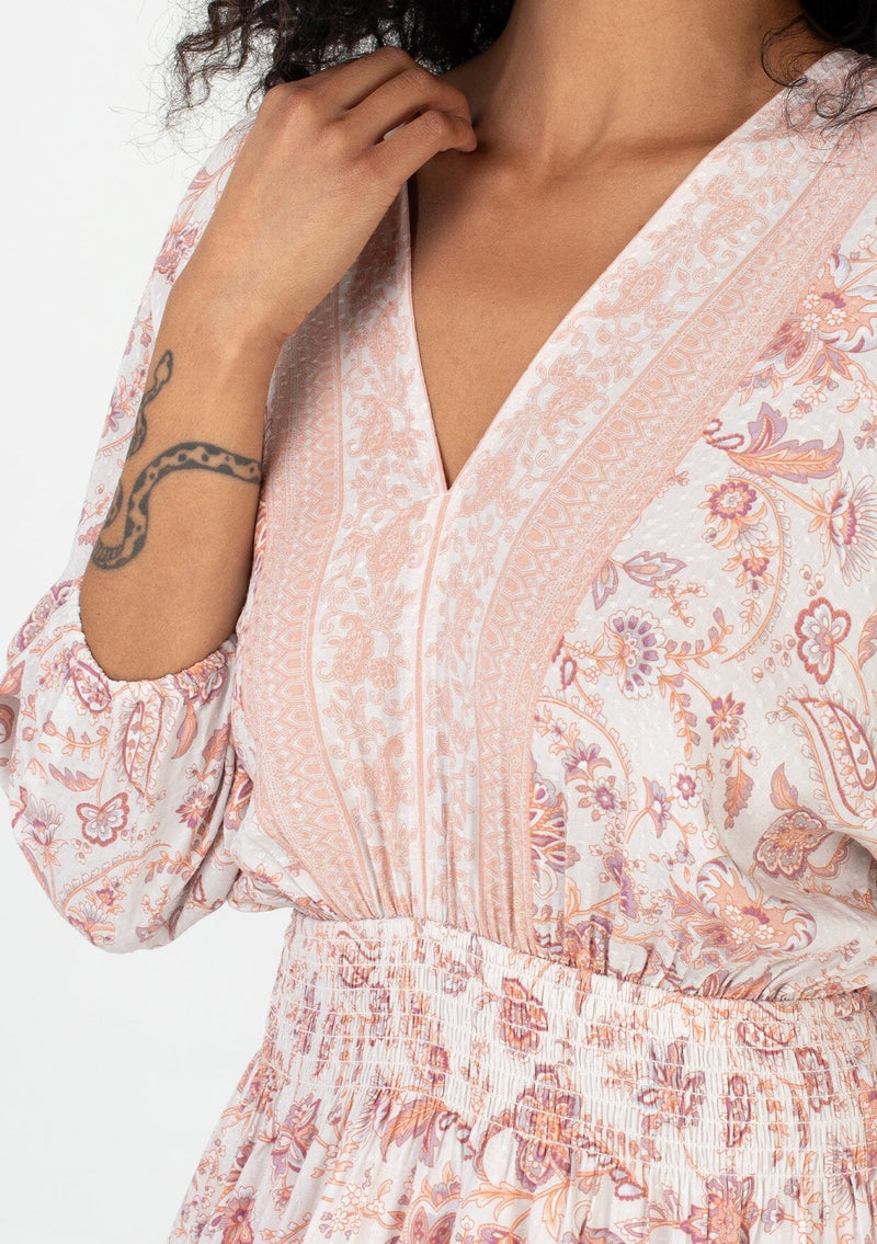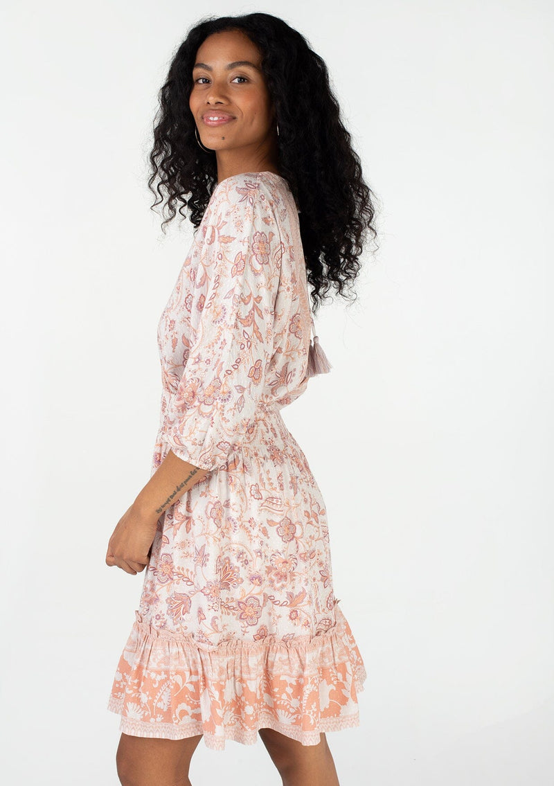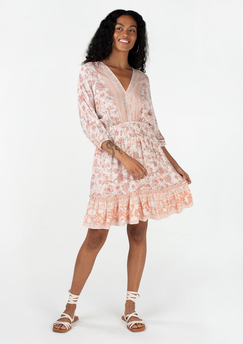 A classic bohemian resort mini dress in a pink floral border print.