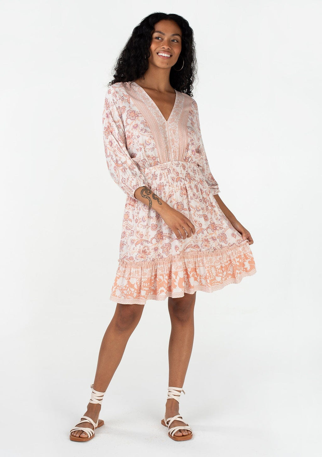 ![[Color: Natural/Clay] A front facing image of a brunette model wearing a bohemian spring mini dress in a pink floral border print. With voluminous three quarter length sleeves, a v neckline, a smocked elastic waist, a ruffle trimmed flowy tiered skirt, and an open back with tassel tie closure.](http://www.shoplovestitch.com/cdn/shop/products/I-72484WL-SFB-OJ_NATURAL-CLAY_160x.jpg?v=1748480966)