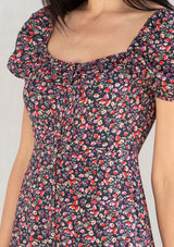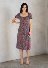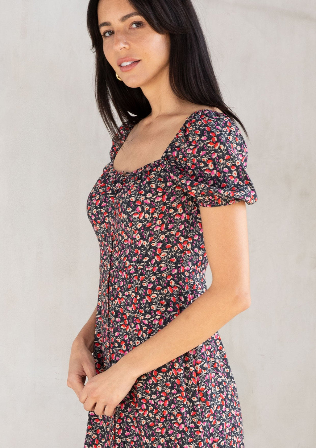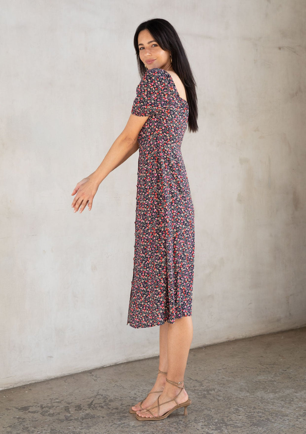 An instant classic, our ultra-flattering bohemian midi dress is designed in a charming ditsy floral print. Featuring short puff sleeves, a delicate self-covered button front, and a trendy square neckline. We love to pair this effortless style with simple gold jewelry.