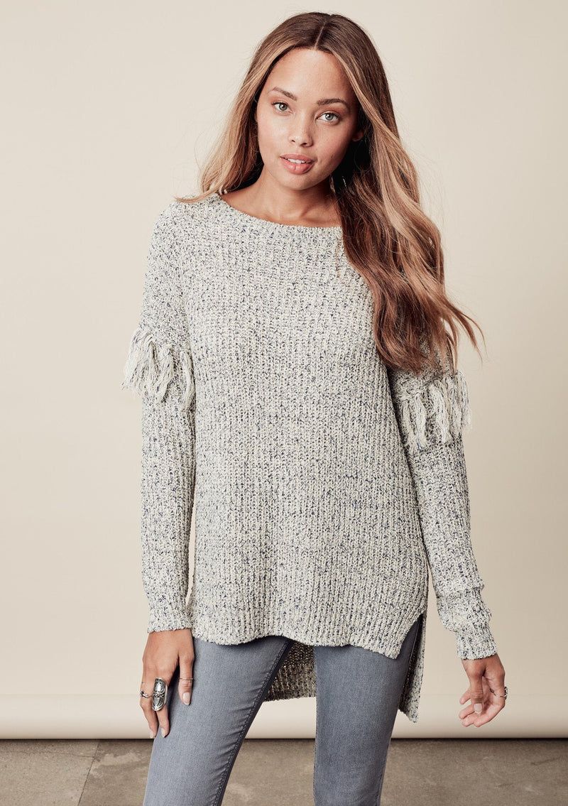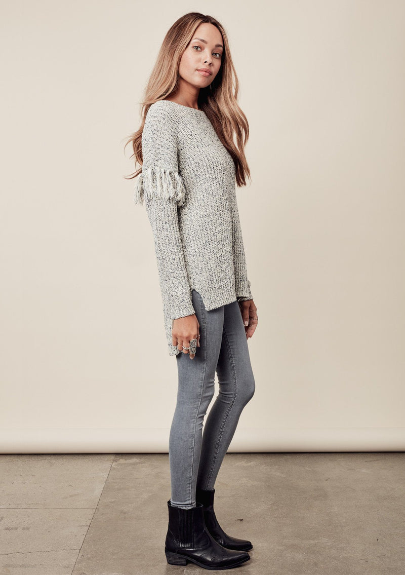 Oversized, slouchy fit, marled knit sweater featuring fringe detail on sleeve.