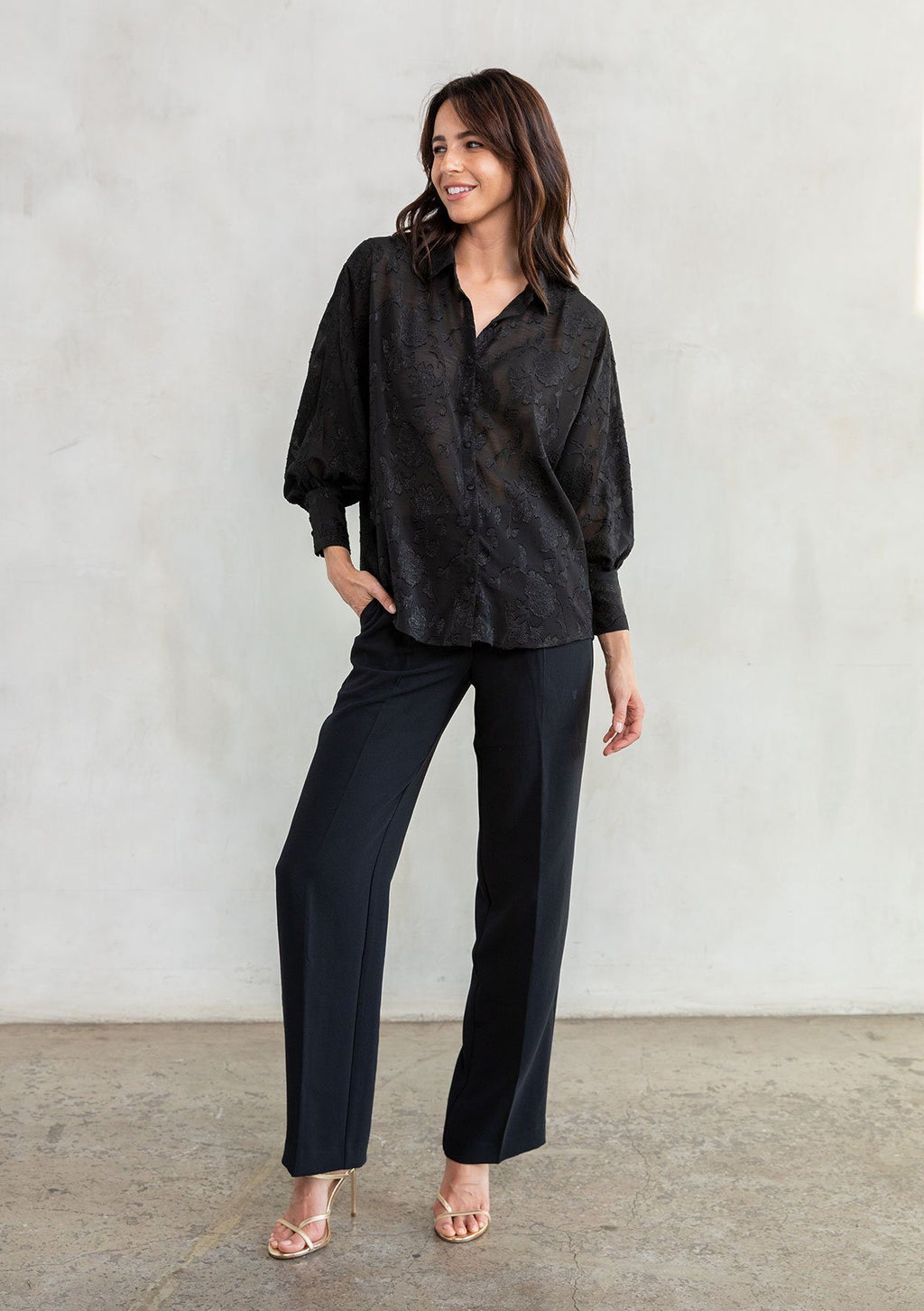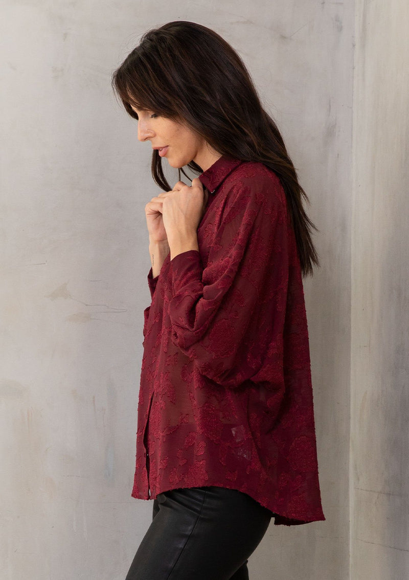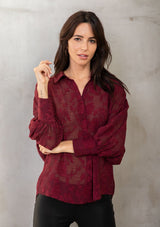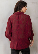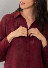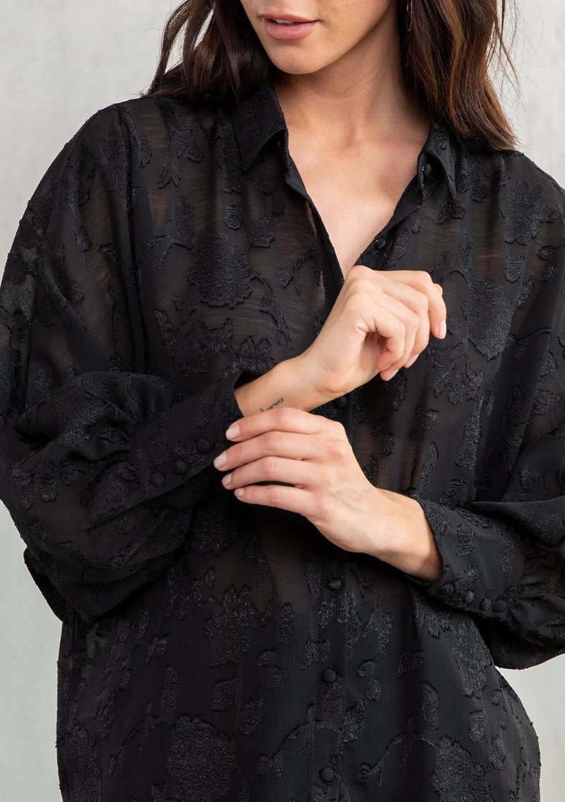 Perfect for day or night, our versatile floral jacquard chiffon top has you covered! This sultry sheer button-up shirt looks great with a cami underneath, or a bralette for nights out on the town. Pretty self-covered buttons add a delicate touch to this elegant top.