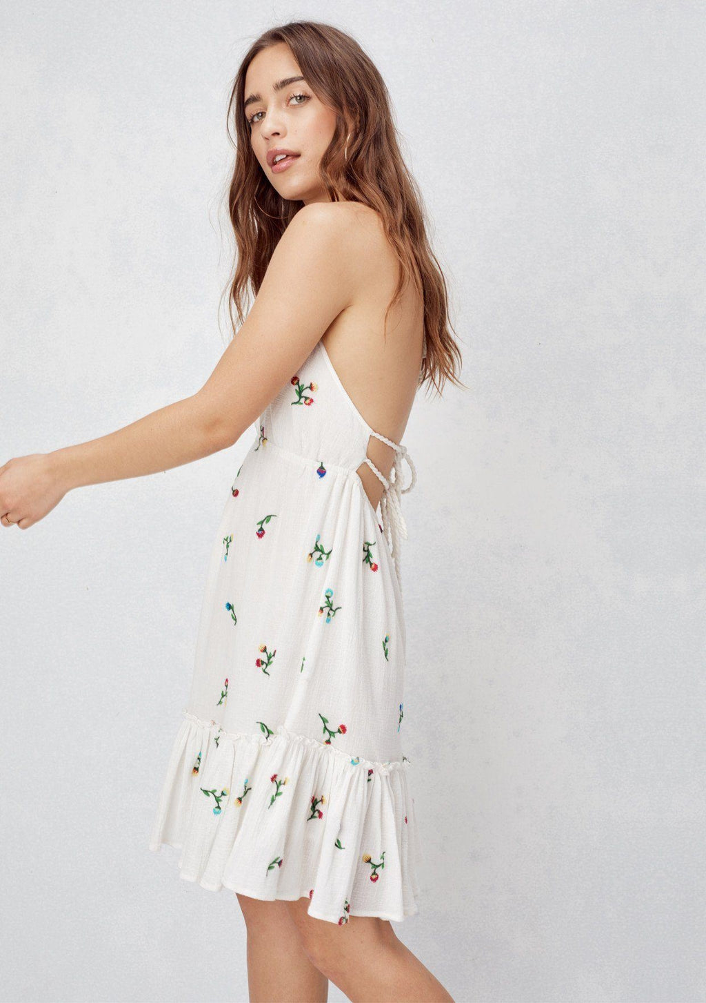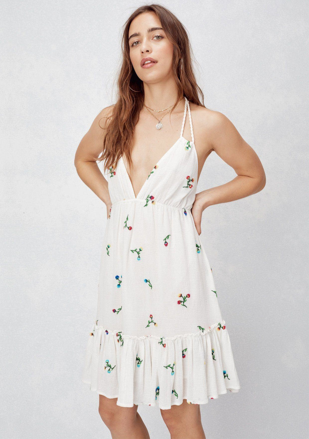 The little white cotton Summer dress of your dreams has arrived! Introducing our ultra cute halter neck mini dress with darling embroidered flowers throughout. Featuring a flirty strappy tie back detail, a flattering empire waist, and a tiered skirt with ruffle details. A feminine and effortless silhouette that is Summer ready!