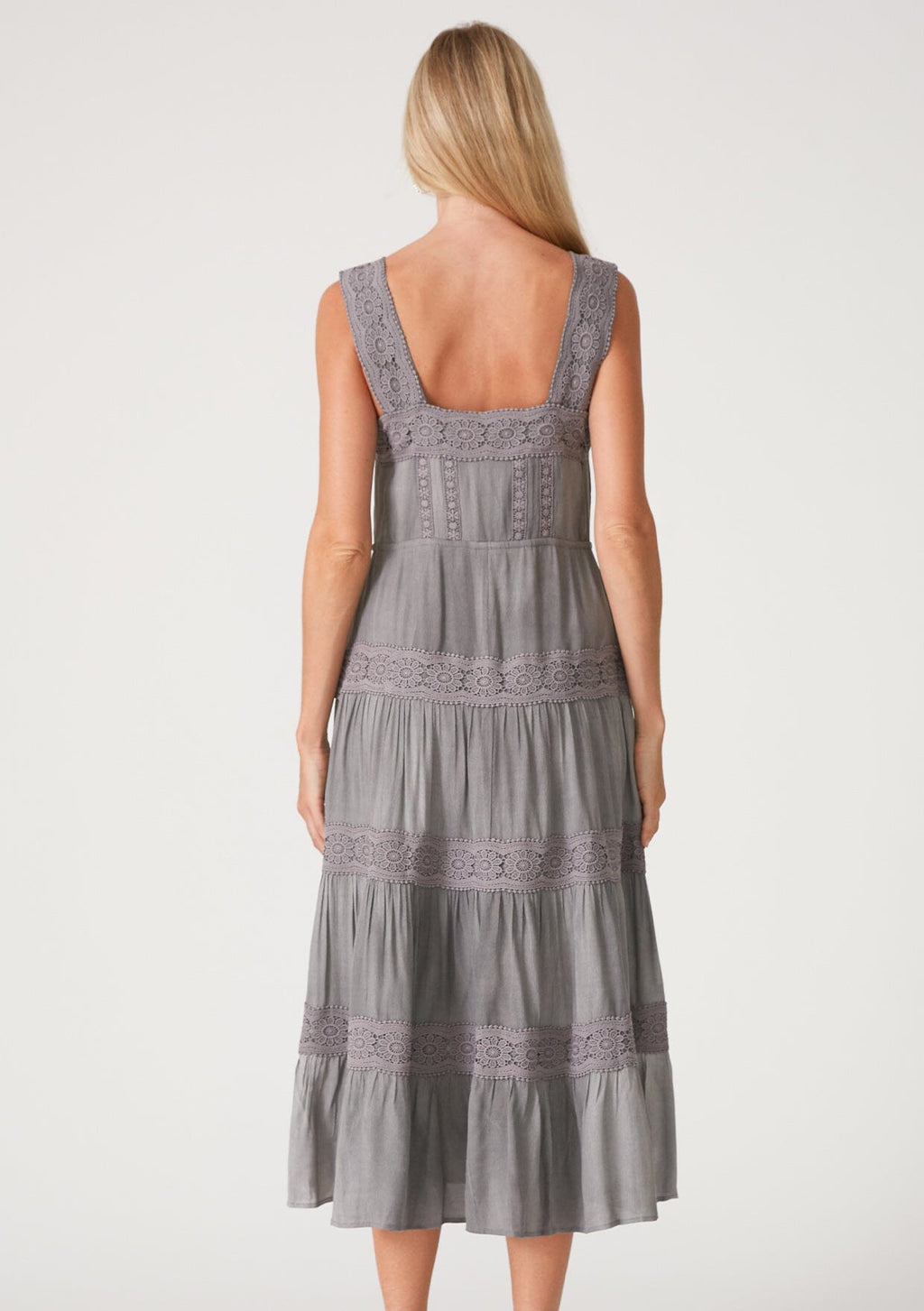 A classic vintage-inspired bohemian midi dress with delicate lace trim detail.