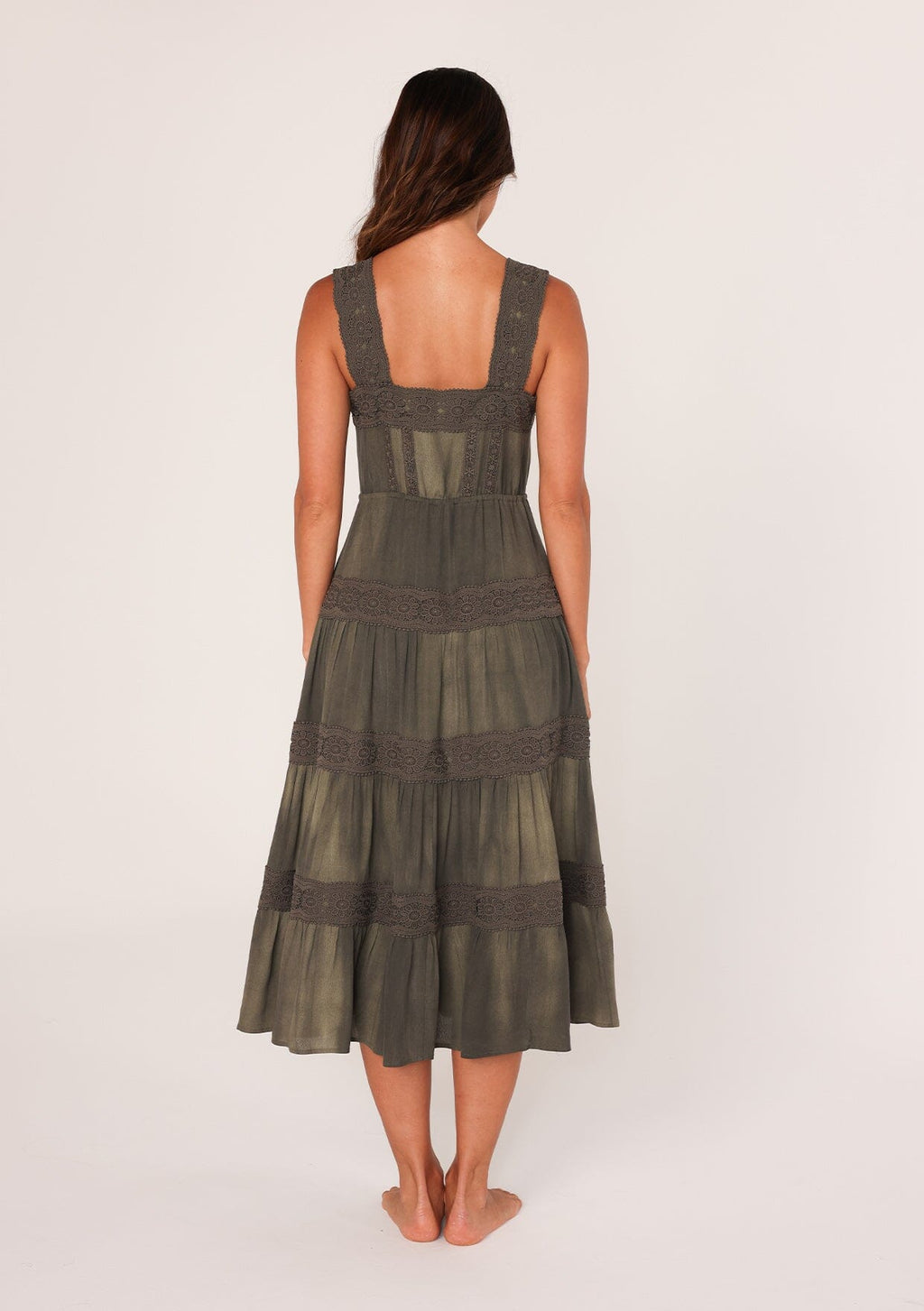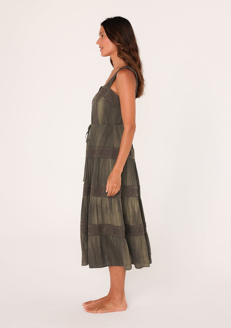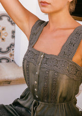 Introducing our must-have dress of the season! A versatile boho style designed in a vintage wash, this effortless midi dress features a feminine square neckline and delicate lace trim detail. The drawstring tie waist and adjustable tank top straps allow for a customizable fit, while the flowy mid-length skirt adds a touch of breezy charm. Perfect for any special occasion or day-to-night transition.