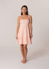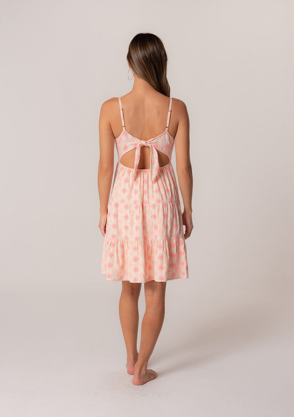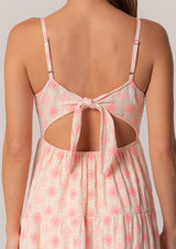 Delicate pink embroidery adds a sweet touch to this classic summer mini dress. Featuring a tiered skirt and a flattering empire waist. The self-tie back and adjustable spaghetti straps allow for a customizable fit.