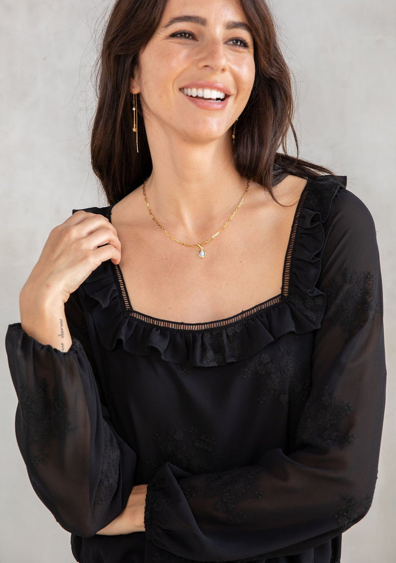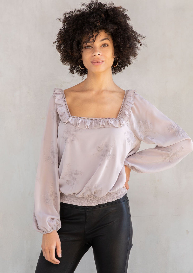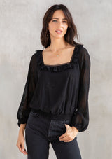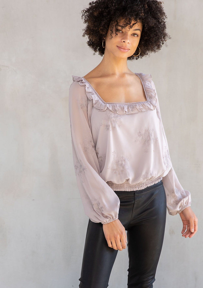 Shop NowFull of dreamy details, this sheer chiffon cropped blouse will quickly become your go-to style for special occasions. Featuring a trendy ruffle-trimmed square neckline, pretty lattice trim details, and voluminous long sleeves. We love to pair this ethereal style with simple gold jewelry.