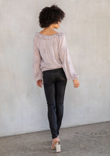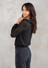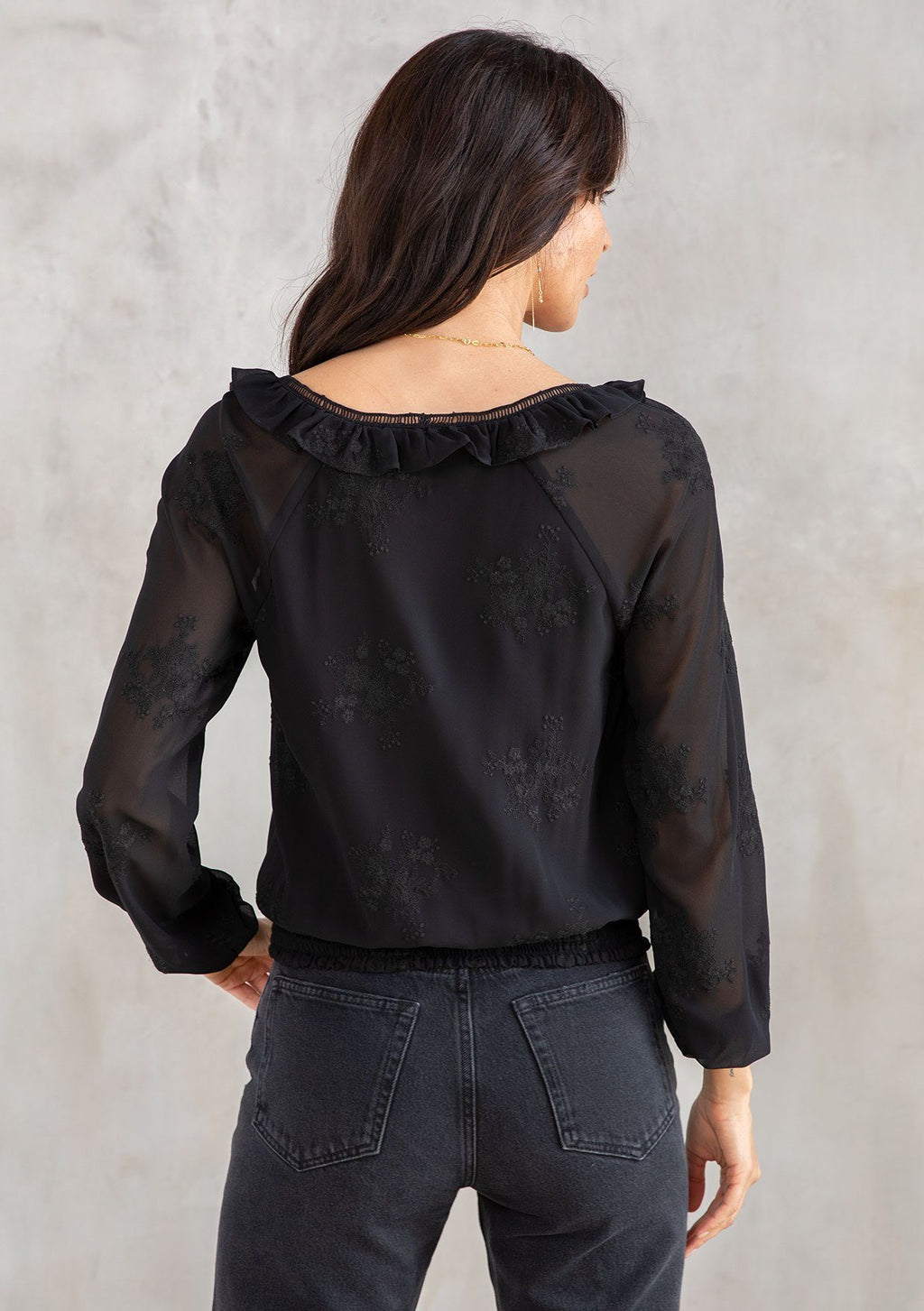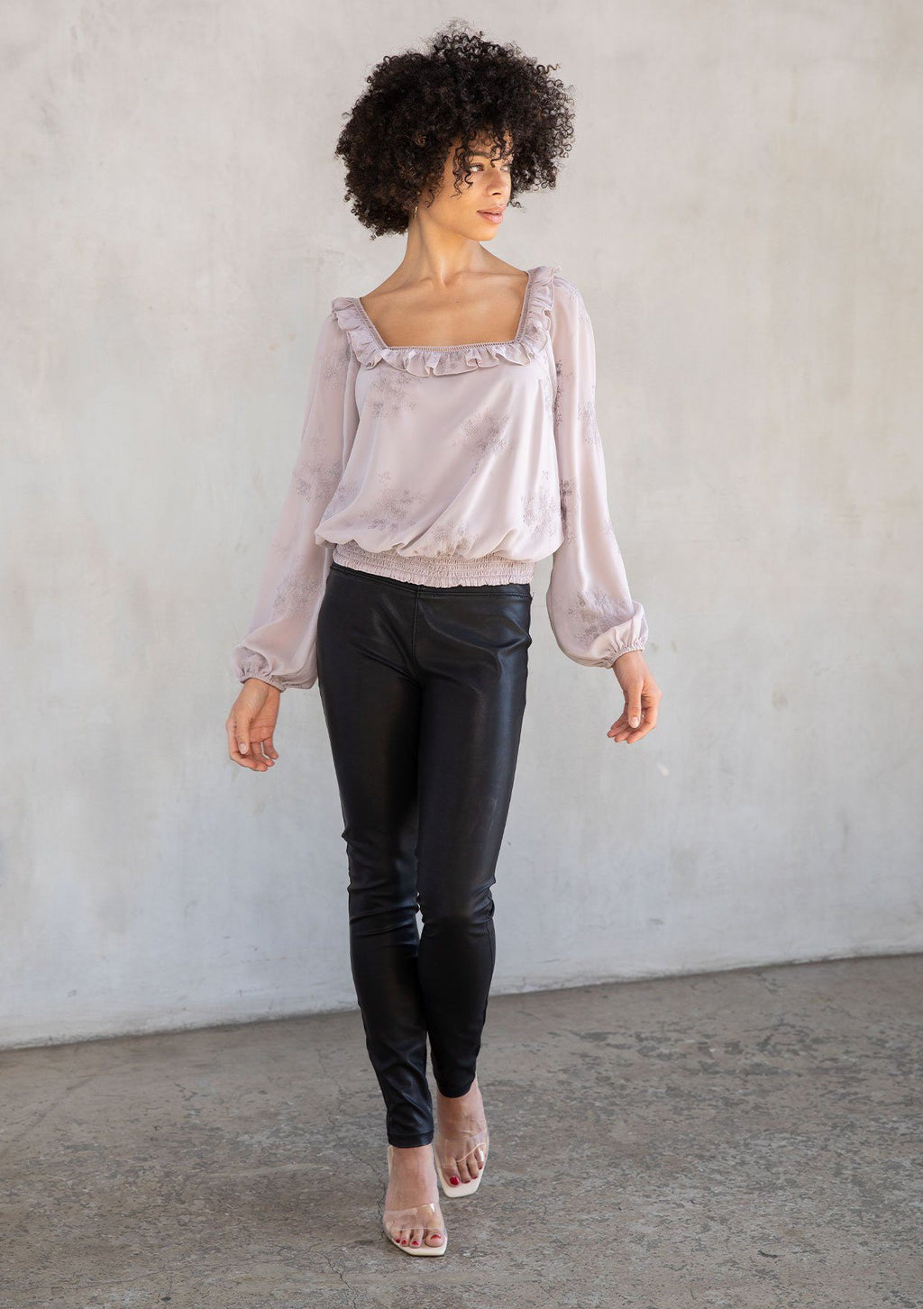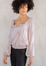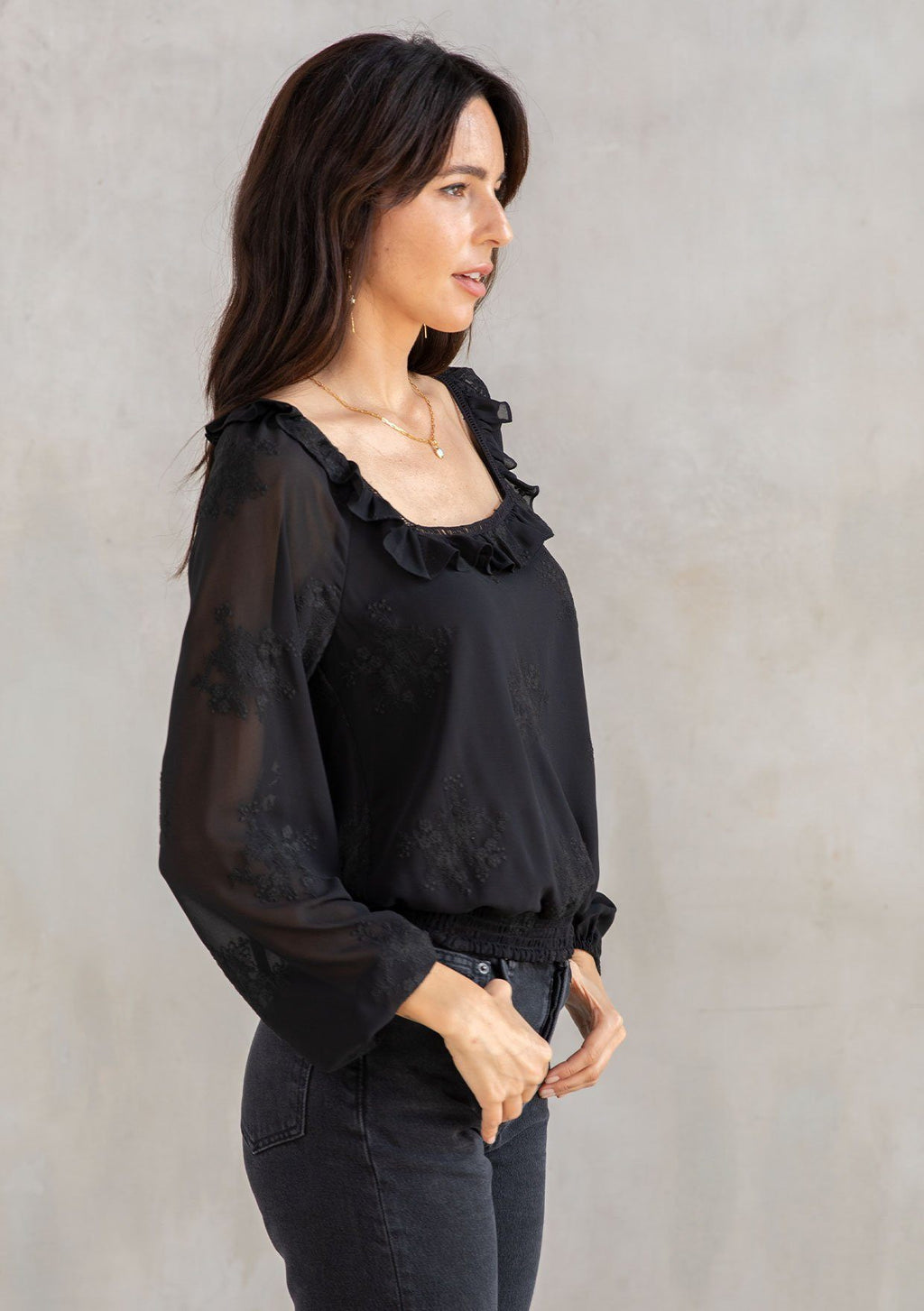 Shop NowFull of dreamy details, this sheer chiffon cropped blouse will quickly become your go-to style for special occasions. Featuring a trendy ruffle-trimmed square neckline, pretty lattice trim details, and voluminous long sleeves. We love to pair this ethereal style with simple gold jewelry.