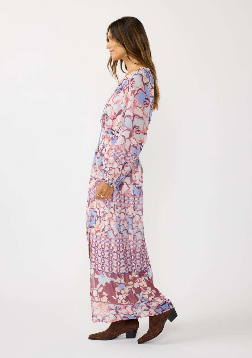 An ultra-dreamy bohemian maxi dress designed in a standout pink & blue floral print.