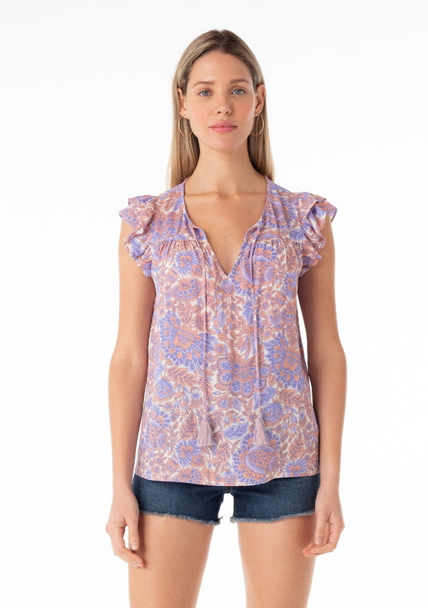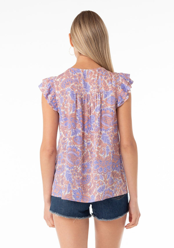 [Color: Lilac] A model wearing a lightweight, lilac looped button front bohemian top in textured paisley jacquard. With short ruffled cap sleeves and a ruffle waist detail. [Color: Lilac] A model wearing a lightweight, lilac looped button front bohemian top in textured paisley jacquard. With short ruffled cap sleeves and a ruffle waist detail.