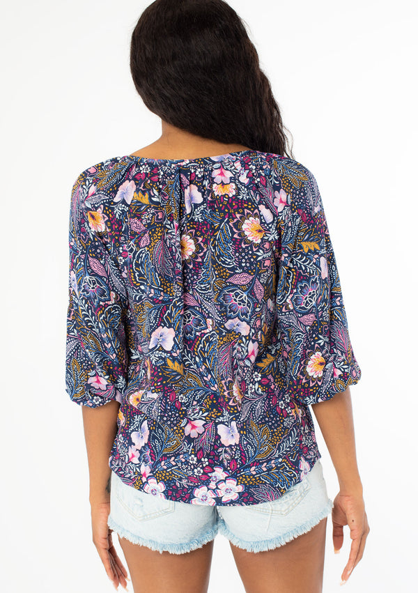 [Color: Navy/Berry] A back facing image of a black model with long dark wavy hair wearing a navy blue and berry purple floral print top. With three quarter length sleeves and a v neckline. [Color: Navy/Berry] A front facing image of a black model with long dark wavy hair wearing a navy blue and berry purple floral print top. With three quarter length sleeves and a v neckline.