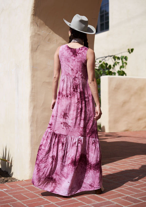 [Color: Coral Multi] A model wearing a vacation ready sleeveless maxi dress in a multicolor mixed print. With a ruffled round neckline, a relaxed flowy fit, and metallic thread details.[Color: Coral Multi] A model wearing a vacation ready sleeveless maxi dress in a multicolor mixed print. With a ruffled round neckline, a relaxed flowy fit, and metallic thread details.