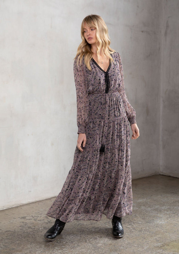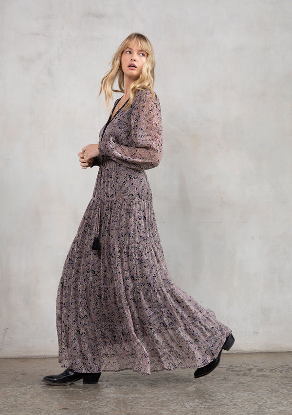 [Color: Gunmetal] A model wearing a dark grey silky maxi dress. With an art deco style paneled skirt, an adjustable strappy back, and voluminous long sleeves.[Color: Gunmetal] A model wearing a dark grey silky maxi dress. With an art deco style paneled skirt, an adjustable strappy back, and voluminous long sleeves.