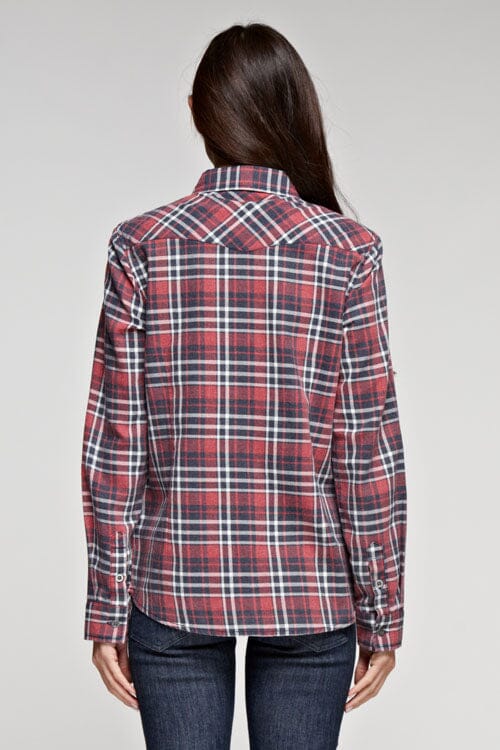 [Color: Red/Black/OffWhite] Lovestitch red long sleeve, snap front plaid shirt in burnt wash with two pocket detail.[Color: Red/Black/OffWhite] Lovestitch red long sleeve, snap front plaid shirt in burnt wash with two pocket detail.